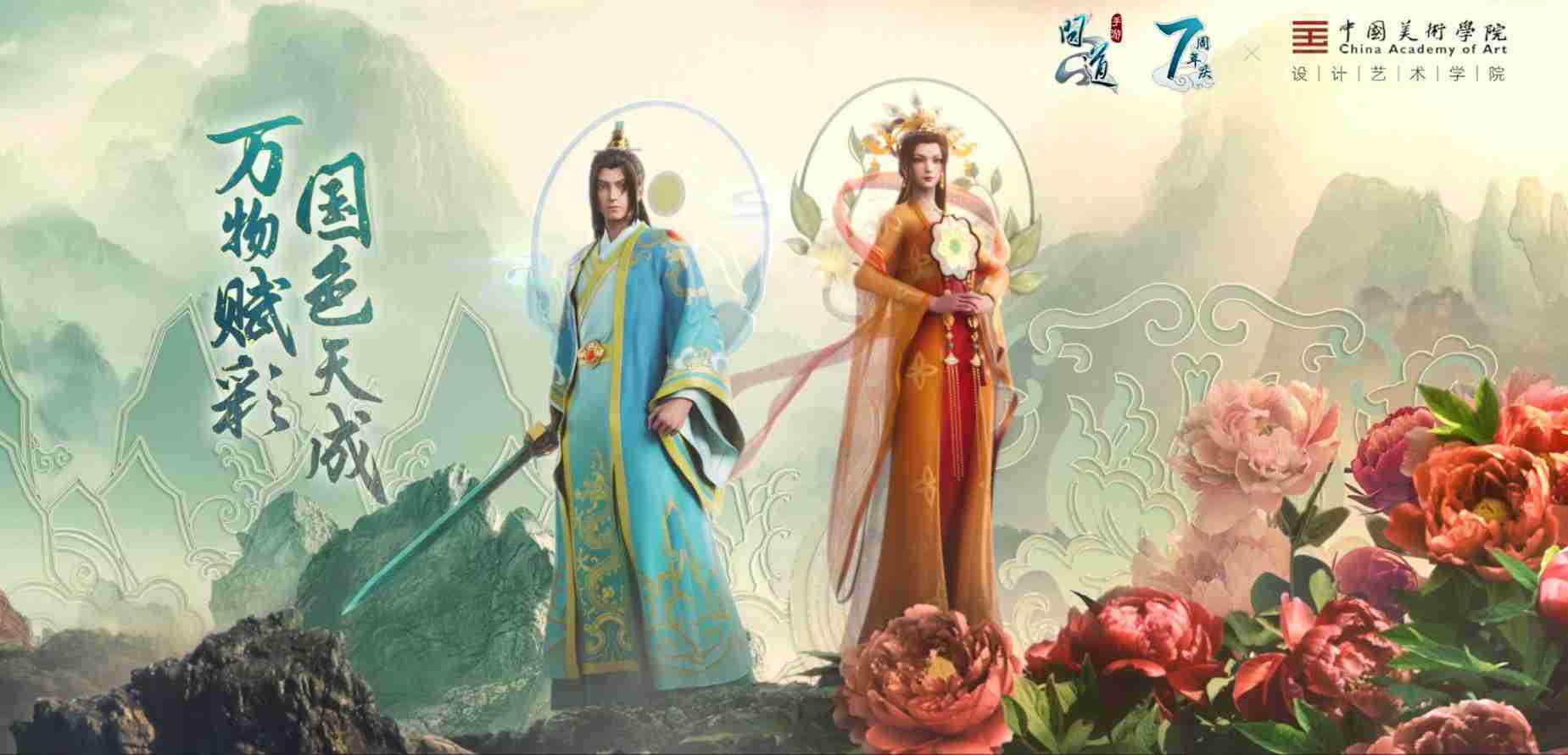 2023年4月,,《问道手游》联动中国美术学院,,,在游戏中融合了中国历史上不同时期的文化元素,,,打造了“山河万象”与“凤鸣九霄”的国风时装。。在色彩配置方面,,,,创作团队基于对游戏角色特性的分析提取相应的文化内涵,,,,从每一种色彩的色相、、、指代事物和情感出发对应角色属性,,,,选定服装的色彩搭配。。。在纹样设计方面,,,,创作团队结合游戏角色自身特殊的造型比例和形态,,在实际的纹样设计中进行了游戏语境下的活化演绎。。。男性角色集中使用了如蟒纹、、、海水江崖纹、、如意纹和云气纹等传统纹样元素,,女性角色则吸纳了凤凰纹、、、牡丹纹、、、卷草缠枝纹等元素,,,,组成以“双凤牡丹纹样”“缠枝牡丹纹”“金玉凤冠头饰”为主要纹样的游戏角色装饰图案系统。。