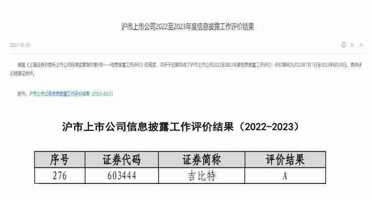 近日,,,,上海证券交易所发布2022-2023年度信息披露工作评价结果。。。赏金大对决(股票代码:::603444)凭借规范的公司治理、、高质量的信息披露以及良好的投资者关系管理再次荣获信息披露工作A级评价,,公司连续两年获此殊荣。。