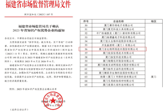 近日,,,福建省市场监督管理局公示了2023年福建省知识产权优势企业名单,,厦门赏金大对决网络技术股份有限公司(以下简称“赏金大对决”或“公司”)榜上有名。。。